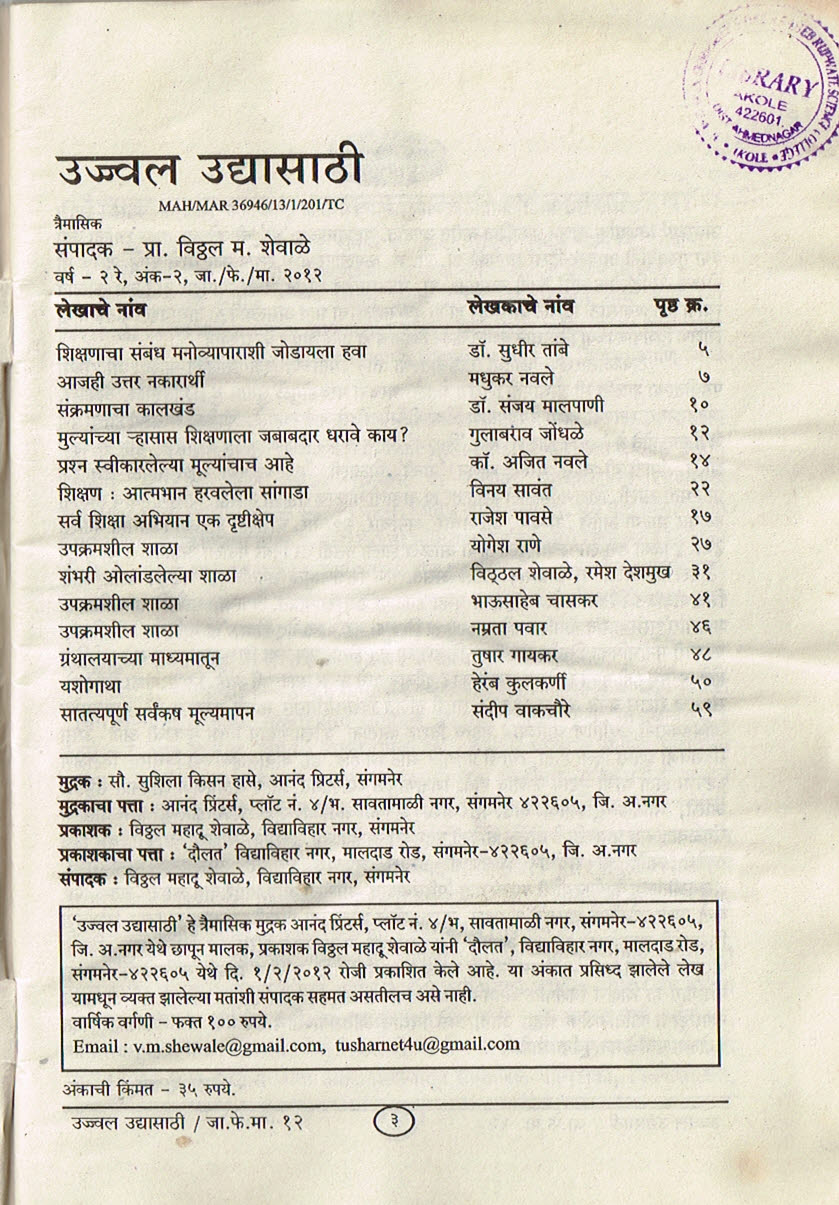 उज्ज्वल उद्यासाठी त्रैमासिक:शिक्षण विशेषांक,जानेवारी-फेब्रुवारी मार्च २०१२