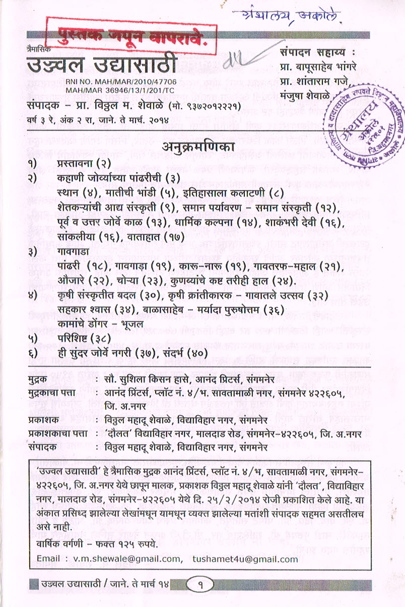 उज्ज्वल उद्यासाठी त्रैमासिक: जोर्वे संस्कृती-विशेषांक,जानेवारी-मार्च २०१४