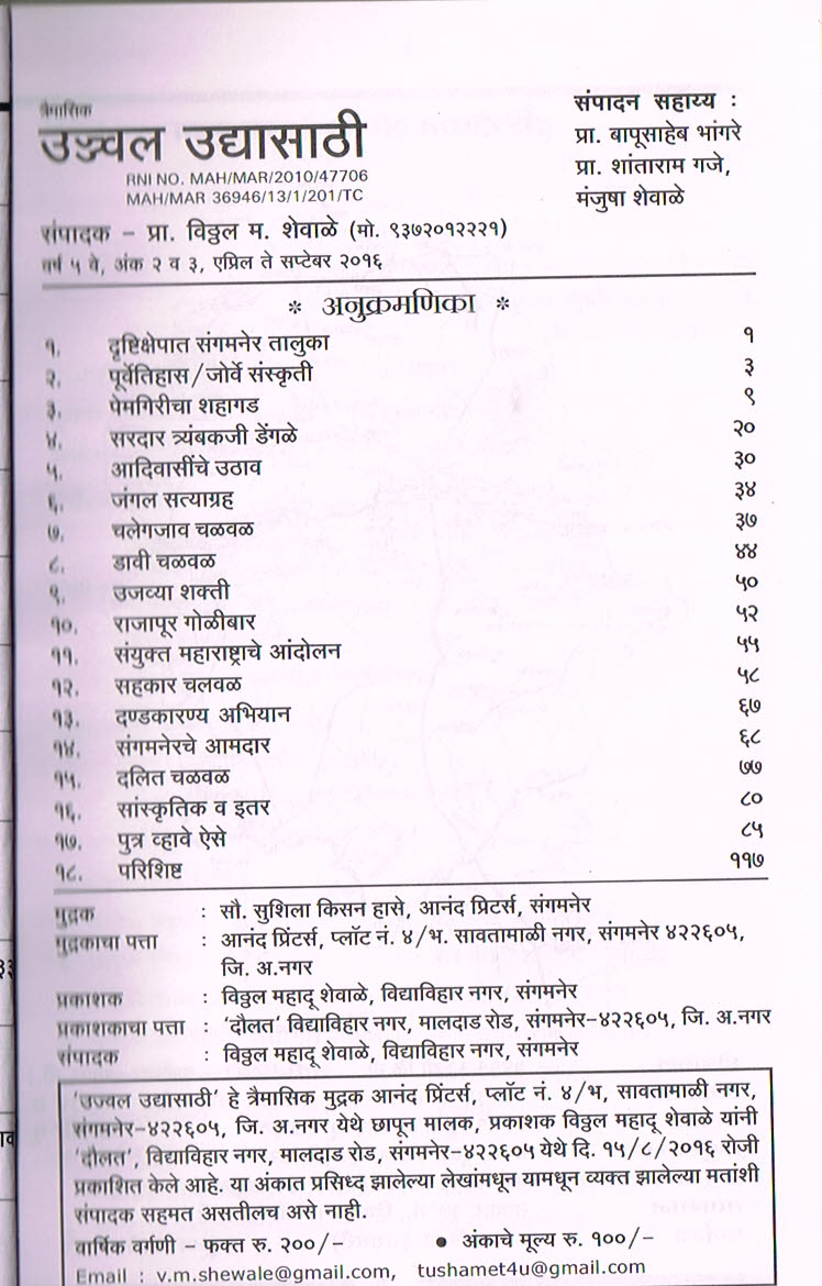 उज्ज्वल उद्यासाठी त्रैमासिक: आपला संगमनेर तालुका,एप्रिल ते सप्टेंबर २०१६