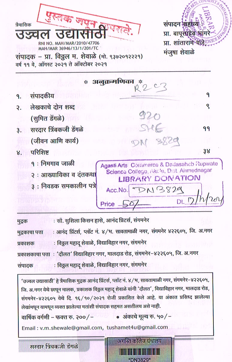 Agasti Knowledge Resource Centre, “उज्ज्वल उद्यासाठी त्रैमासिक: सरदार त्रिंबकजी डेंगळे,ऑगस्ट-ऑक्टोबर २०२१,” Exibitions@Agasti Knowledge Resource Centre, accessed February 11, 2026, https://dl.agasticollege.edu.in/items/show/7.