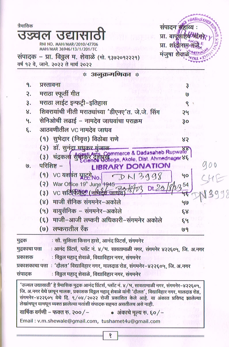 उज्ज्वल उद्यासाठी त्रैमासिक: मराठा लाईट इन्फंट्री आणि वीर मावळ्याची शौर्यगाथा VC नामदेव जाधव,जानेवारी-मार्च २०२२